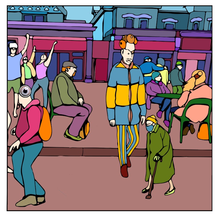 The piece presents a vibrant tapestry of urban life, captured through a lens that blends whimsy with reality. The central figure, adorned in a blue and yellow coat and striped pants, serves as a grounding force amidst the flurry of activity. This character, with rollers in their hair, strides forward, perhaps symbolizing the routine and sometimes mundane march of daily existence.